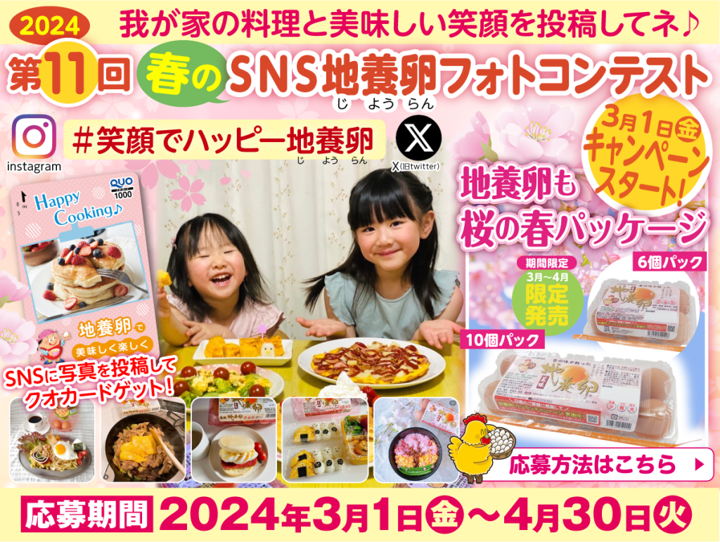 1年ぶりに第11回春のSNS地養卵フォトコンテストの開催が決定しました!今回のテーマは#笑顔でハッピー地養卵皆様が楽しくお料理をして、笑顔あふれる家族の食卓風景、お料理風景、たまご料理自慢、お菓子作り、おいしい満点笑顔など、あなたのハッピーな(地養卵とのひととき)写真をXエックス(旧ツイッター)とInstagramでどしどし応募してください。投稿受付の開始は3月1日からです。皆様のたくさんの投稿をお待ちしています!