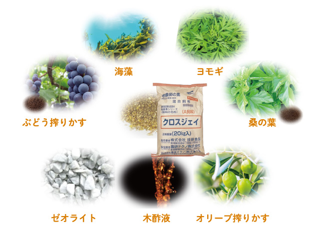 桑の葉、ぶどう搾りかす、オリーブ搾りかす、海藻、ヨモギ、木酢液等の天然物や