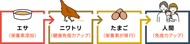 特殊旨味飼料(クロスジェイ®)は、鶏の体質改善を促し、健康な鶏から産まれたたまごを人々が食することができます。