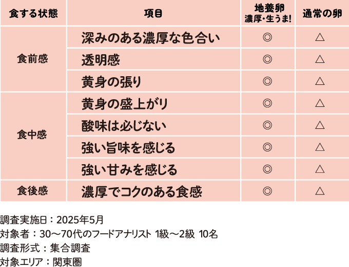 人(日本の味覚にも精通したフードアナリスト)による調査だけでなく、科学的な視点でも地養卵 濃厚・生うま!の美味しさについて調査を実施しました
